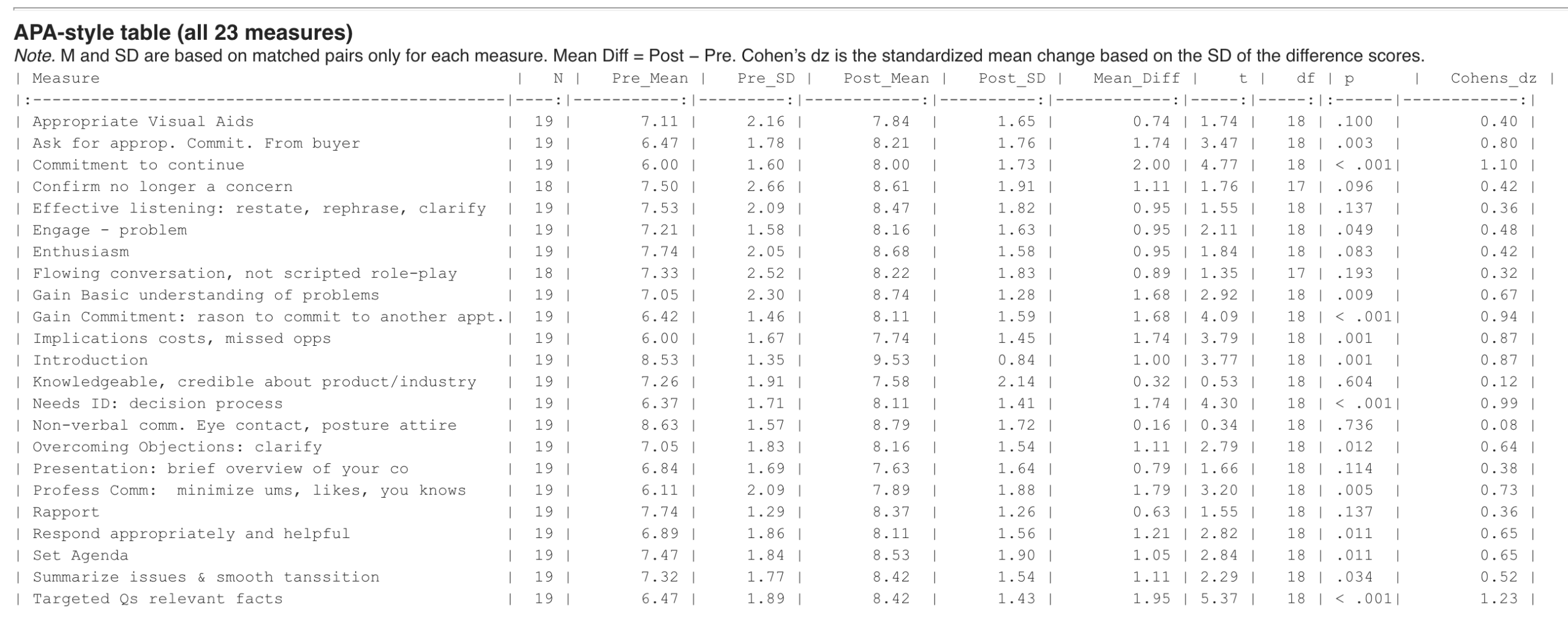 Several additional competencies showed positive but non-significant improvements, with small-to-moderate effects: Appropriate Visual Aids, Confirm no longer a concern, Presentation: brief overview of your company, Rapport, Effective listening: restate, rephrase, clarify, Flowing conversation, not scripted role-play, Enthusiasm, Knowledgeable, credible about product/industry, and Non-verbal comm. (eye contact, posture, attire), |t(17–18)| ≤ 1.76, ps ≥ .083, dz ≈ 0.08–0.42. Thus, while all competencies trended upward, statistically reliable gains were most pronounced for competencies related to needs diagnosis, implication questioning, commitment-gaining behaviors, and several aspects of professional verbal communication.