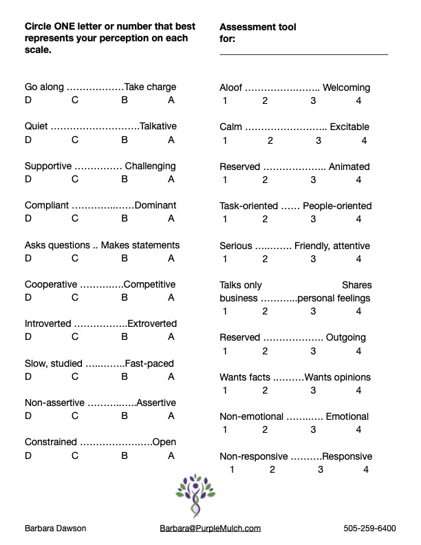 After the students have had a chance to discuss it, hand each one a copy of the Social Styles Assessment Tool (Image 1). Tell them to pick a number or letter between D and A and 1 and 4. Only pick one number/letter for each line.